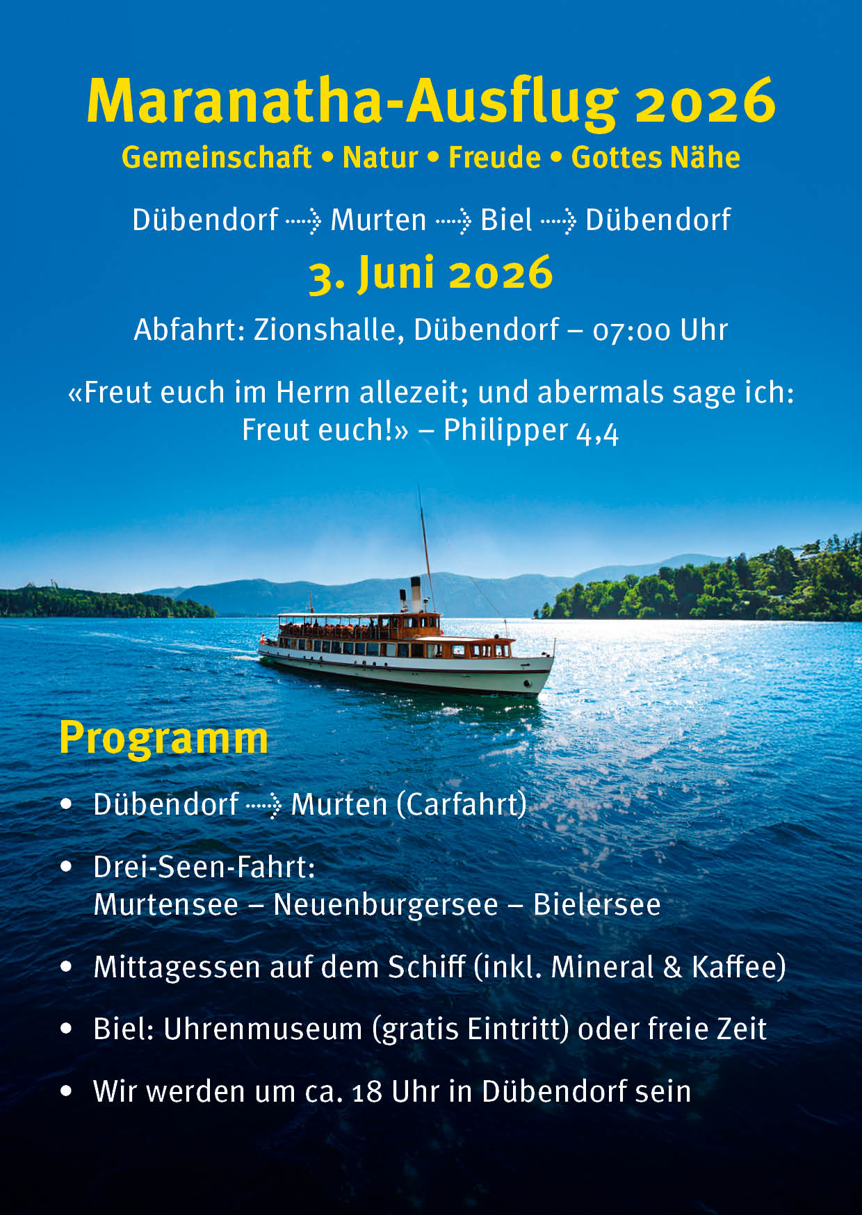 Abfahrt: Zionshalle, Dübendorf – 07:00 Uhr